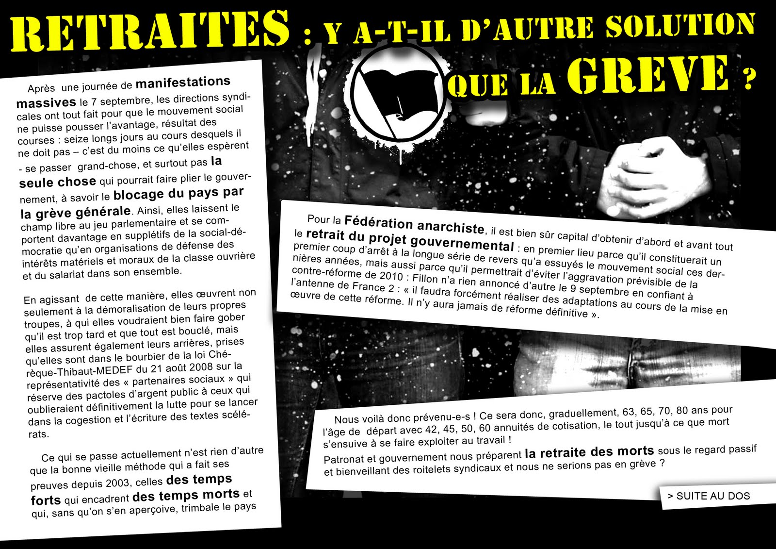 Évidemment que j'espère me gourer, mais on aura rien d'autre que la promesse perlimpimpin des socialistes de revenir aux 60 ans (lire à ce sujet le texte hilarant de fontenelle dans le dernier cqfd). Autant boycotter cette manif. mille personnes dans les rues, deux cent selon la police, thibaut et chérèque humiliés, virés comme des merdes pour incompétence par leur syndicat respectif.