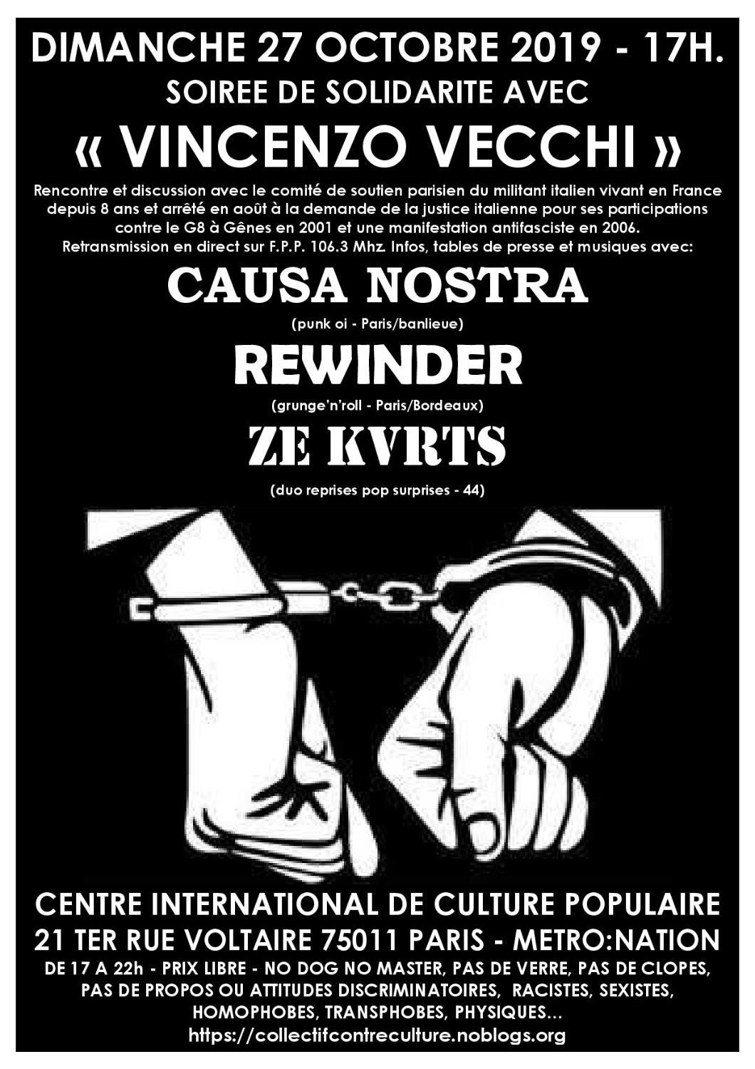 Continuons à affirmer notre présence et notre soutien pacifique et déterminé à notre camarade Vincenzo, qui risque l’extradition en Italie suite à une condamnation à 12 ans et demi de prison ferme pour avoir manifesté au contre-sommet du G8 à Gênes en 2001 et à une manifestation anti fasciste à Milan en 2006.