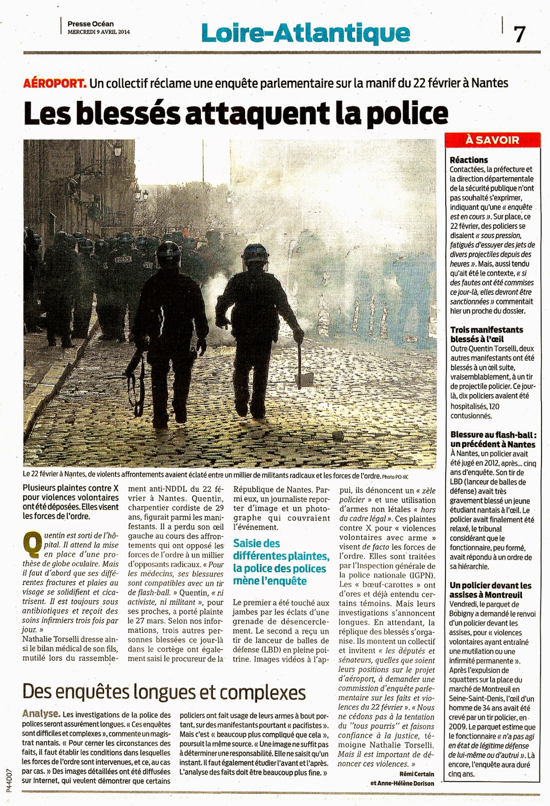 Trois jeunes hommes ont été grièvement blessés à l’œil par des tirs policiers, lors de la manifestation du 22 février à Nantes contre l’aéroport de Notre-Dame-des-Landes. L'un est éborgné et les deux autres ont peu de chances de retrouver la vue. Sur la page Facebook d’appel à témoignages qui a été créée, plusieurs autres manifestants affirment, photos à l’appui, avoir été atteints par des tirs de Flashball au visage : sur le crâne avec neuf points de suture, sur la joue ou encore à la lèvre. Quatre enquêtes pour violences ont déjà été confiées à la délégation rennaise de l'Inspection générale de la police nationale (IGPN).