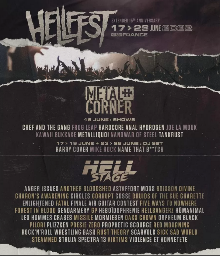 Je parlais des groupes qui ouvr(ai)ent les scènes - sachant que ça fait un paquet que je n'ai pas mis les pieds là-bas et que ça a probablement changé - et des groupes qui jou(ai)ent au Métal Corner, aujourd'hui doublé de la Hellstage.bub a écrit : ↑22 juin 2023 16:02voyons voir pour cette édition :